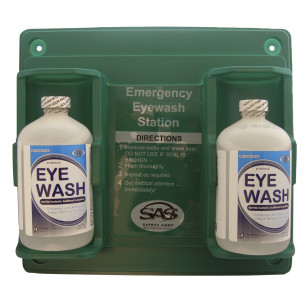 Dual bottle eyewash station for temporary first-aid until victim can reach a larger unit